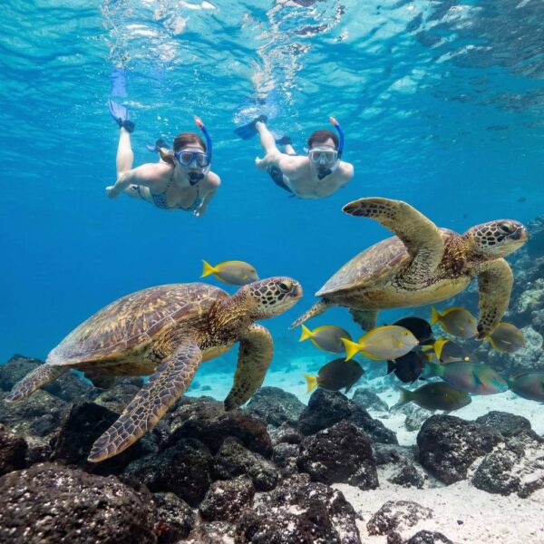 En el snorkel podrás ver tortugas marinas, tintoreras / tiburones de Galápagos, rayas y una gran variedad de peces tropicales multicolor que convierten a Santa Fe en uno de los mejores sitios para nadar con fauna en estado natural.